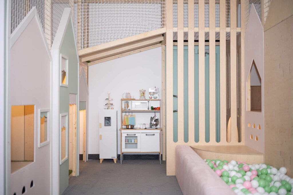 W środku czekają miniaturowe domeczki przypominające urokliwe miasteczko, pełne zakamarków do odkrywania i zabawy w odgrywanie ról. Dzieci mogą wspinać się, zjeżdżać po zjeżdżalni prosto do kolorowego basenu z kulkami oraz eksplorować bezpieczne konstrukcje zabezpieczone siatkami.